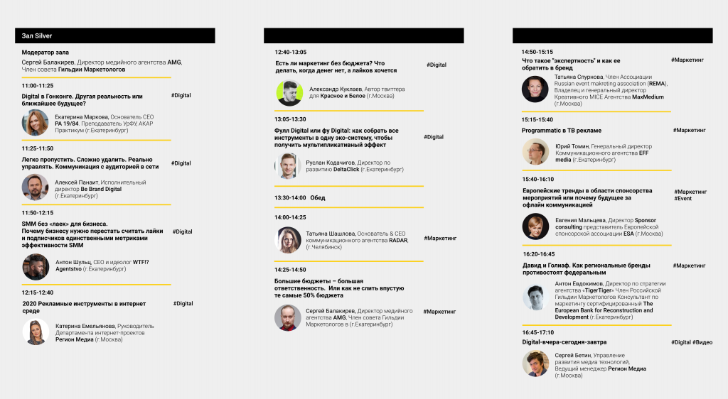 На Национальном рекламном форуме в Екатеринбурге выступят более 30 топовых экспертов в сфере маркетинга и рекламы. Программа поделена на несколько блоков: МАРКЕТИНГ, DIGITAL, EVENT, ВИДЕО. Деловая часть будет включать доклады и выступления спикеров, а также интерактивные форматы — панельные дискуссии, воркшопы и коворкинги. Участники будут говорить о глобальных трендах индустрии, использовании технологий дополненной реальности в рекламе, компьютерных играх, современных нативных форматах рекламы и не только.