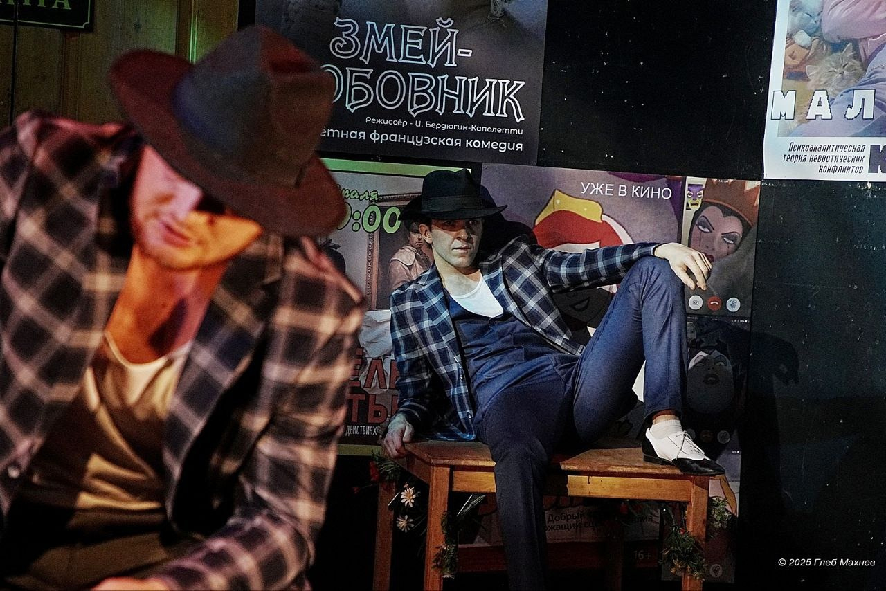 «... Маленький театр. Вечер. Буфет. Женя и Дима, два сорокалетних артиста, сидят в буфете театра. Театр маленький. Буфет маленький. Фойе маленькое. Сцена крошечная.