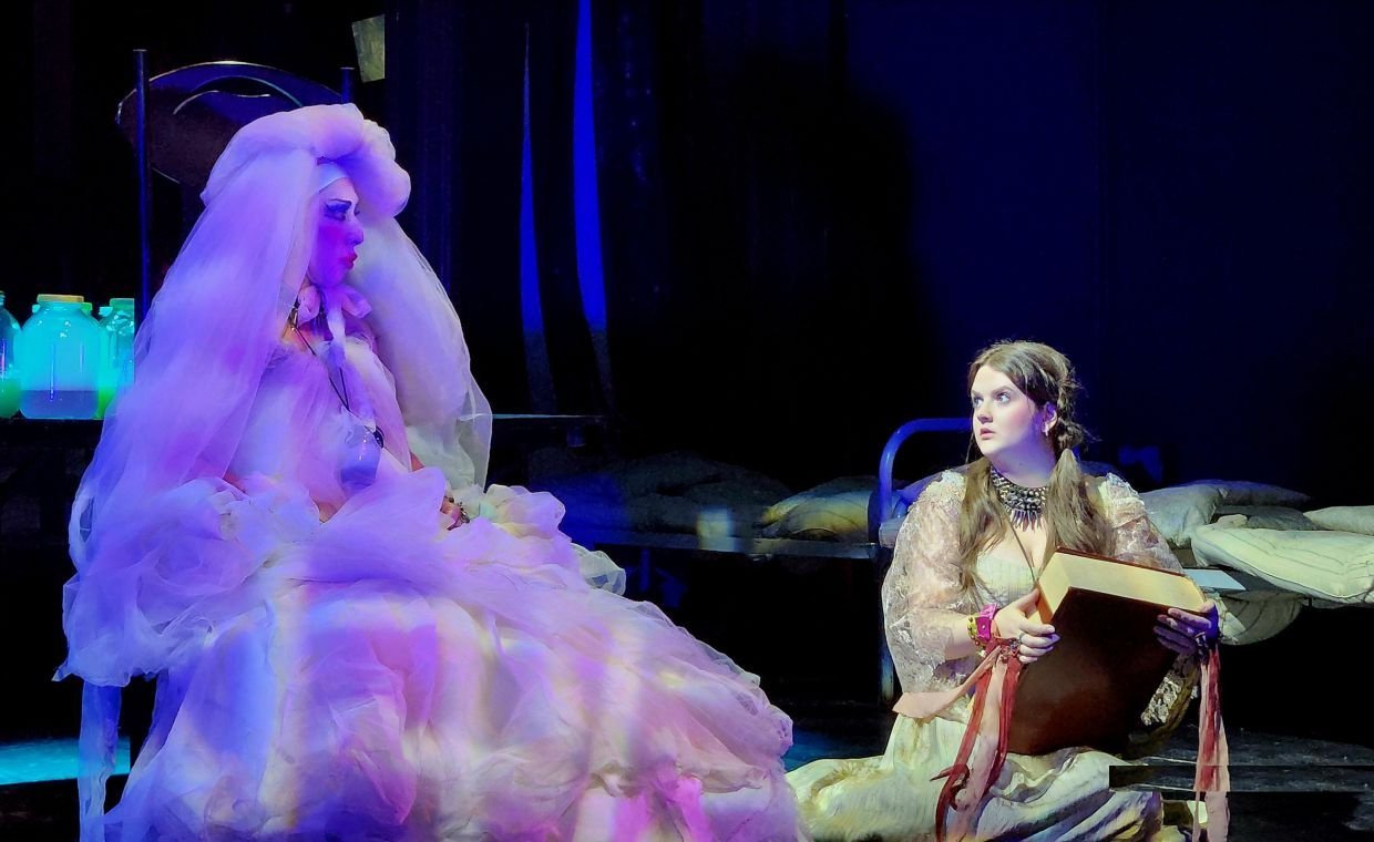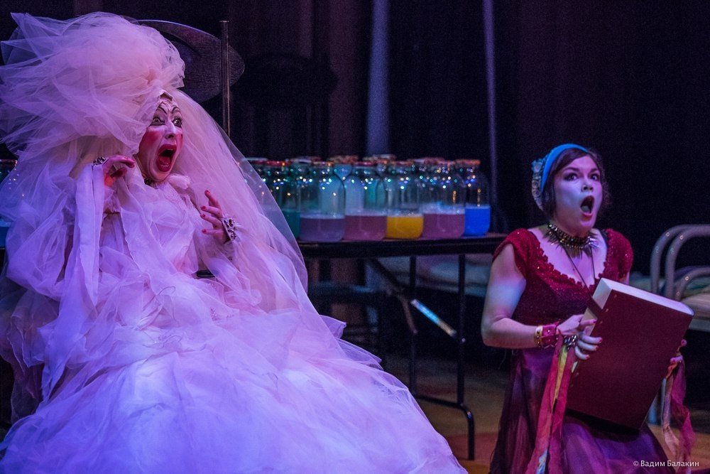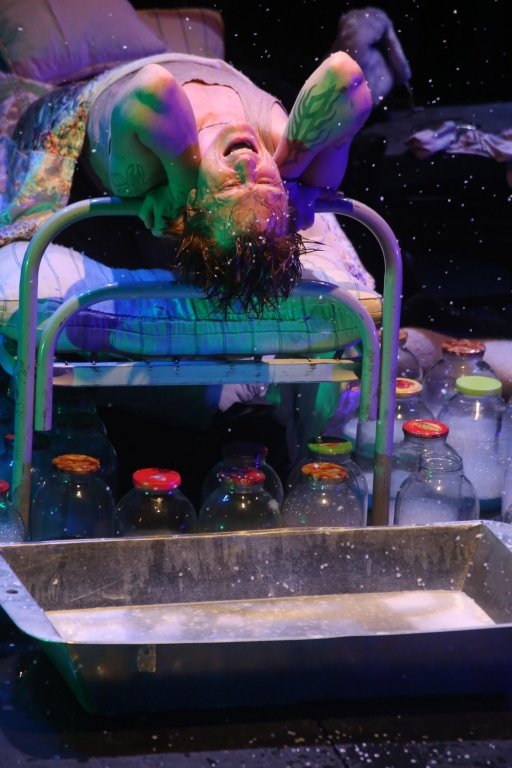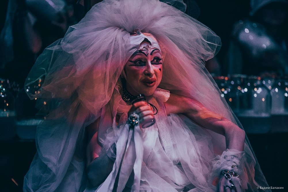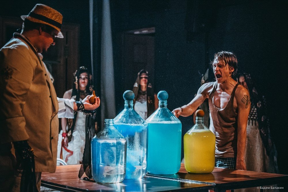 В этом спектакле соединены современные ритмы и старинные русские романсы. У героев весьма странные костюмы, а в декорации – не менее странные трехлитровые банки (их сто штук на сцене) с белой пеной внутри. Что в них: наркотик, сладкая вата?