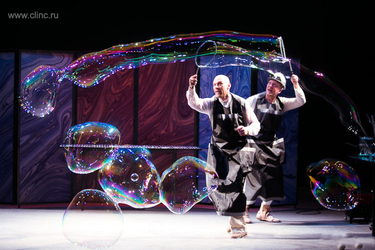 Детские«Clinc!» — это комические номера и визуальные спецэффекты, которые делают его особым, уникальным и инновационным спектаклем. Основа спектакля — юмористические сценки (репризы) и трюки с мыльными пузырями.